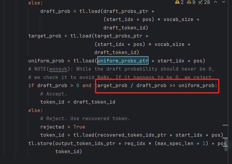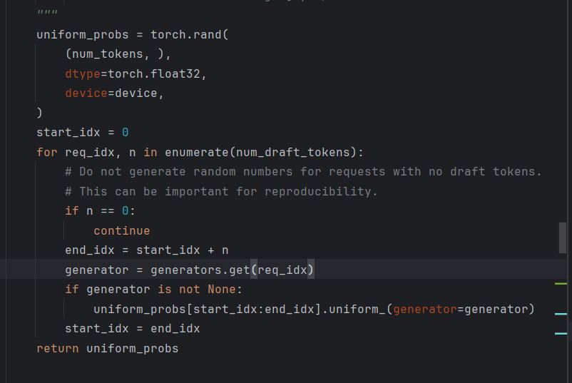 这个介绍是错误的。 但也让我们看到一些东西。实际vllm中的实现如下,要大于一个均匀分布的概率: