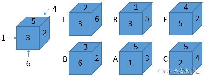 骰子是一个立方体,每个面一个数字,初始为左1,右2,前3(观察者方向),后4,上5,下6,用123456表示这个状态,放置在平面上,