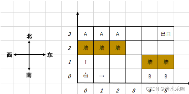 机器人固定从方格(0,0)出发,只能向东或者向北前进。出口固定为房间的最东北角,如下图的方格(5,3)。用例保证机器人可以从入口走到出口。