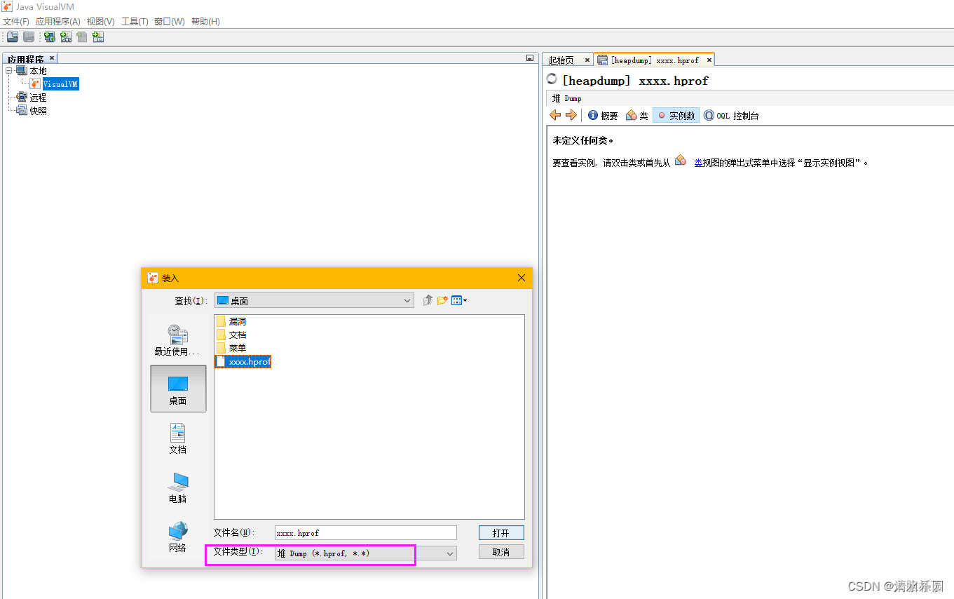 在jdk安装目录下,jdk1.8.0_60\bin下,有jvisualvm.exe工具,打开这个工具,点击文件->装入->文件类型选择hprof->选择dump.hprof。如下图: