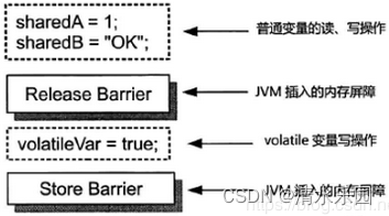 对于 volatile 变量的写操作,Java 虚拟机会在该操作之前插入一个释放屏障[禁止 volatile 写操作与该操作之前的任何读、写操作进行重排序,从而保证了 volatile 写操作之前的任何读、写操作会先于 volatile 写操作被提交],并在该操作之后插入一个存储屏障[具有冲刷处理器缓存的作用,因此在 volatile 变量写操作之后插入的一个存储屏障就使得该存储屏障前所有操作的结果(包括 volatile 变量写操作及该操作之前的任何操作)对其他处理器来说是可同步的],如下图: