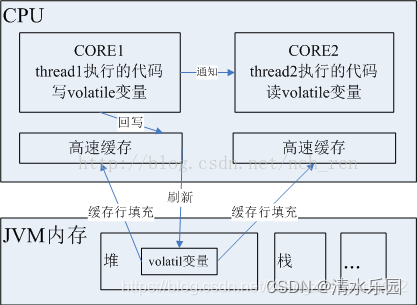以多核CPU为例(两核),我们知道 CPU的速度比内存要快得多,为了弥补这个性能差异,CPU 内核都会有自己的高速缓存区,当内核运行的线程执行一段代码时,首先将这段代码的指令集进行缓存行填充到高速缓存,如果非 volatile 变量当 CPU执行修改了此变量之后,会将修改后的值回写到高速缓存,然后再刷新到内存中。如果在刷新回内存之前,由于是共享变量,那么CORE2 中的线程执行的代码也用到了这个变量,这是变量的值依然是旧的。volatile关键字就会解决这个问题的,如何解决呢,首先被 volatile关键字修饰的共享变量在转换成汇编语言时,会加上一个以 lock为前缀的指令,当CPU发现这个指令时,立即做两件事: