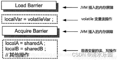 对于 volatile 变量读操作,Java 虚拟机会在该操作之前插入一个加载屏障(Load Barrier),并在该操作之后插入一个获取屏障(Acquire Barrier),如下图: