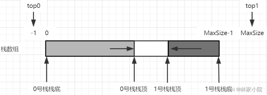 在上述设置中,data数组表示共享栈的存储空间,top0和top1分别为两个栈的栈顶指针,这样该共享栈通过data、top0和top1来标识,也可以将它们设计为一个结构体类型: