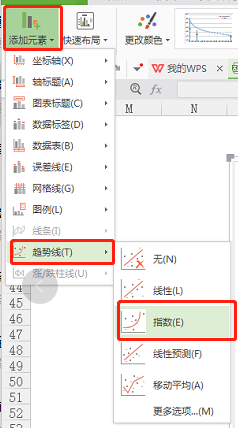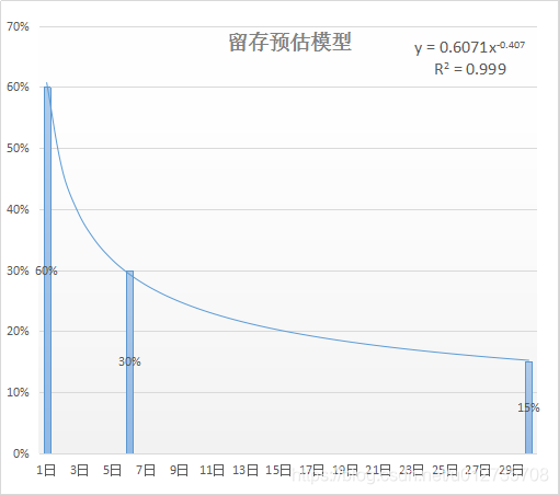根据问题,我们已知次留,7留和月留,可以在excel里生成一个留存率预估模型。通过现有数据插入图表,然后点击图表,选择“添加元素”→“趋势线”→“指数”,针对留存率问题指数和对数的比较常见,这里选用了指数模型,