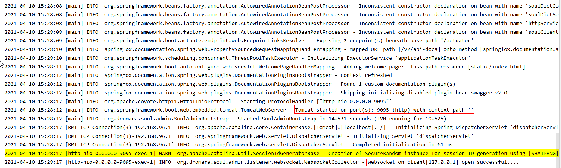 启动 SoulBootstrapApplication类;看到 websocket成功连接网关管理台的内容: