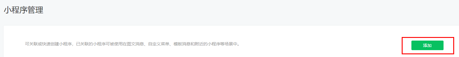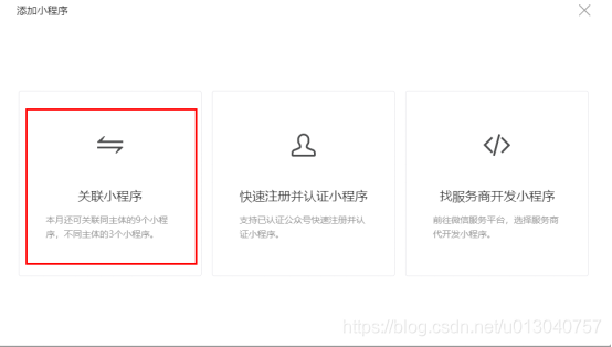 1.登录公众号管理后台,找到菜单栏中的小程序管理,点击右侧内容中的“添加”。 1.登录公众号管理后台,找到菜单栏中的小程序管理,点击右侧内容中的“添加”。 2.选择第一个“关联小程序” 3.扫码验证身份