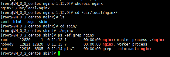 可以看到,我的nginx是安装在了/usr/local/nginx。进入安装目录,执行./nginx 启动nginx,然后用ps 命令看看nginx进程启动情况。