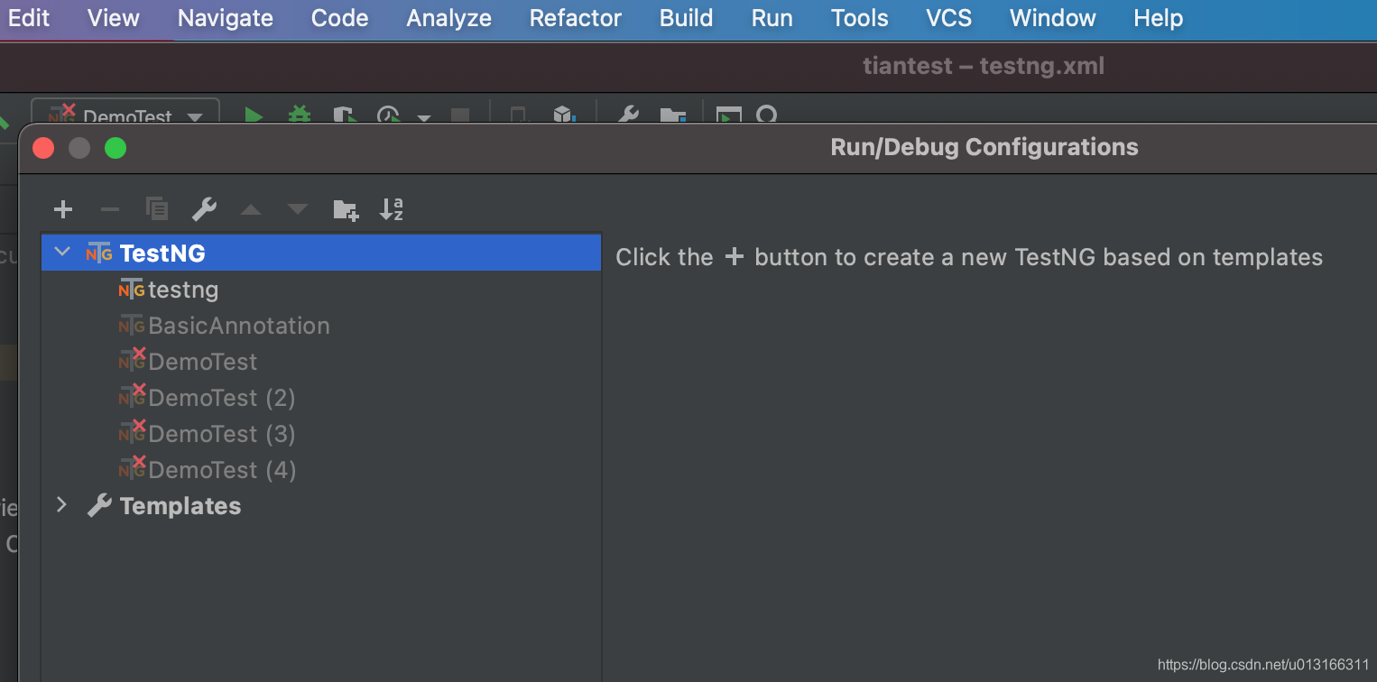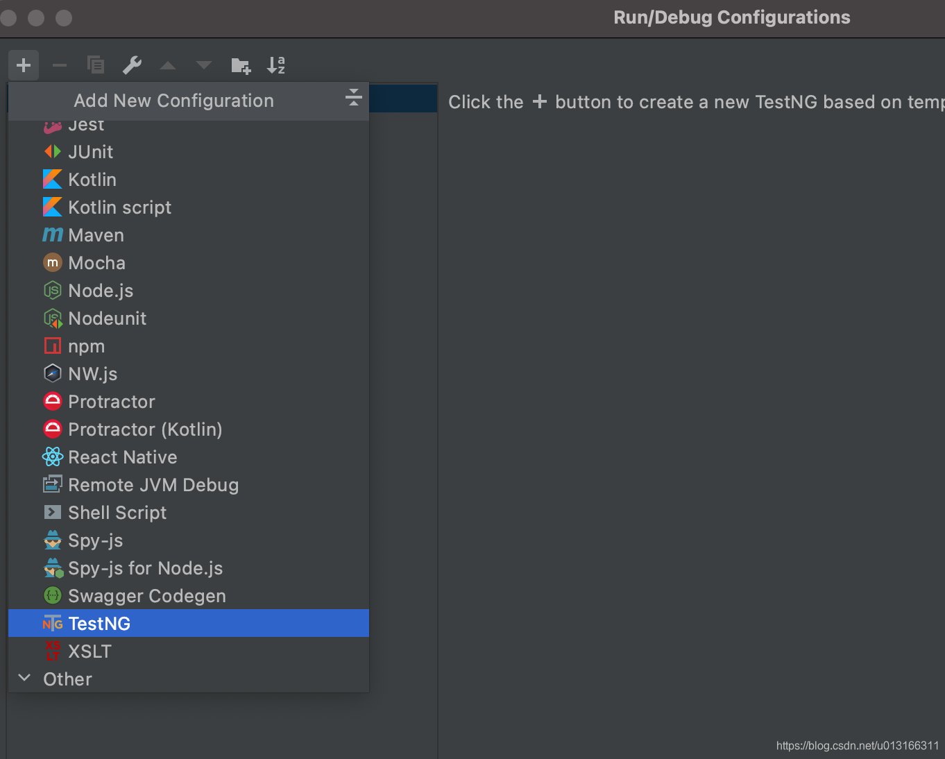 2、选中TestNG,点击左上角+号,选择TestNG 选项