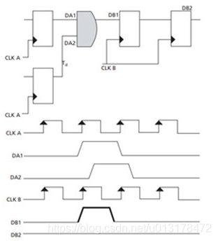 在下图中,如果CLK B在DA变化的时候来对DA进行采样,那么DB就会出现亚稳态。