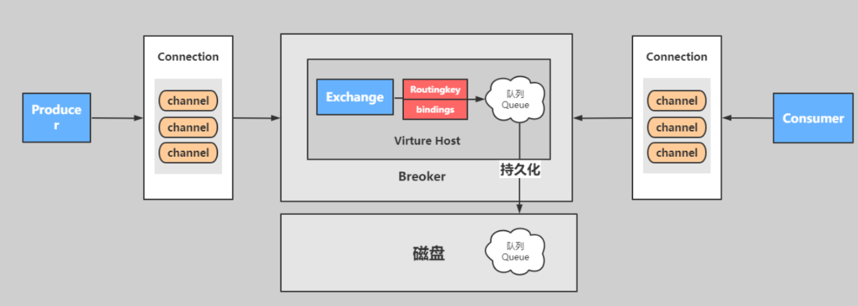 - 队列(Queue):用于存储消息。队列是先进先出(FIFO)的,消息存储在队列中,直到被消费者取走。
