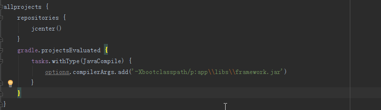{ jcenter() } //添加以下代码,使classes-full-debug.jar包编译先于android.jar gradle.projectsEvaluated