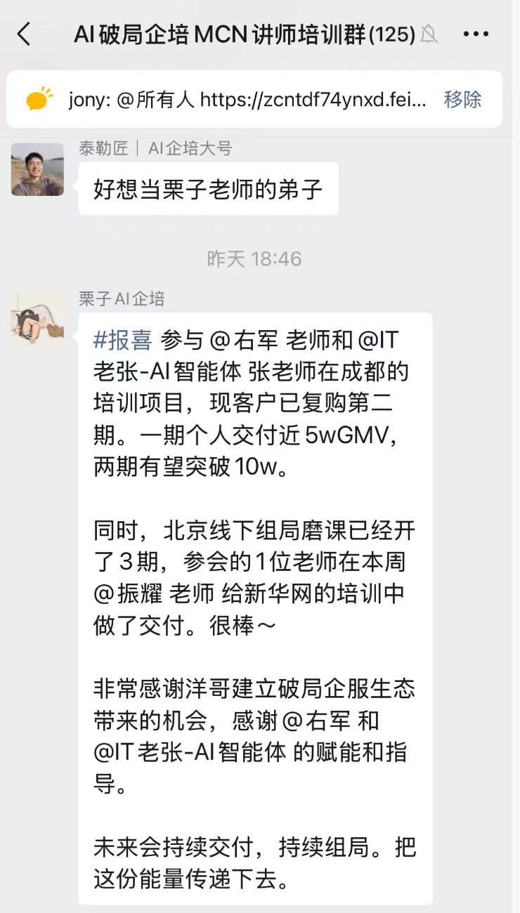 #报喜 参与@右军 老师和@IT老张-AI智能体 张老师在成都的培训项目,现客户已复购第二期。一期个人交付近5wGMV,两期有望突破10w。