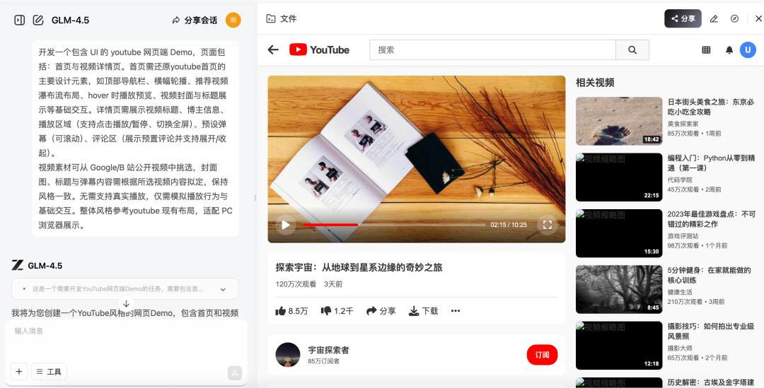 GLM-4.5在测试中完成了一个复杂度极高的产品任务:仿YouTube网页端Demo的搭建,需求包括首页+视频详情页两部分,页面风格、功能交互、视觉排布需高度还原YouTube官网。