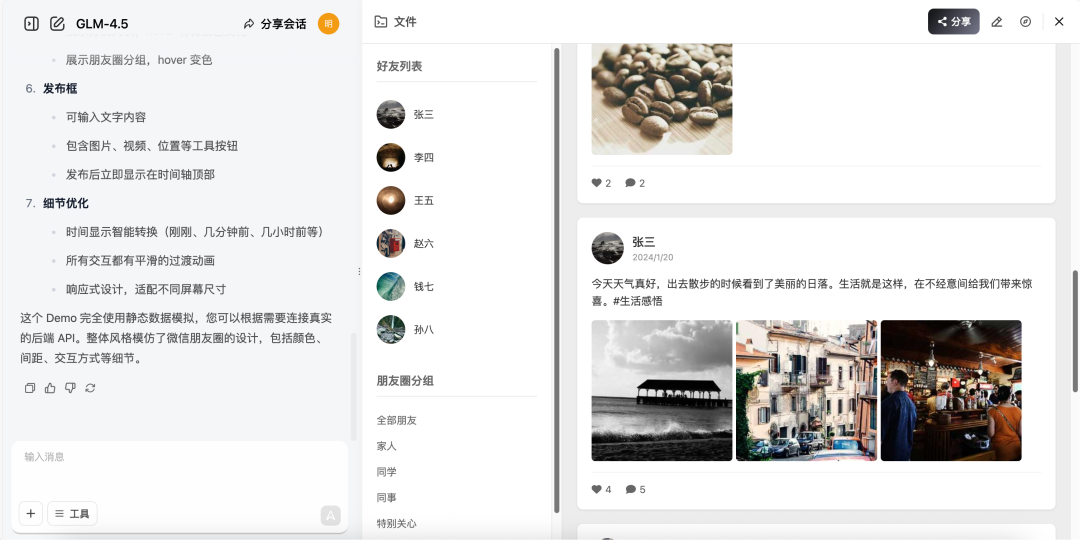 指令:生成一个仿朋友圈的时间轴页面,支持图片视频状态、点赞评论交互、按时间排序。