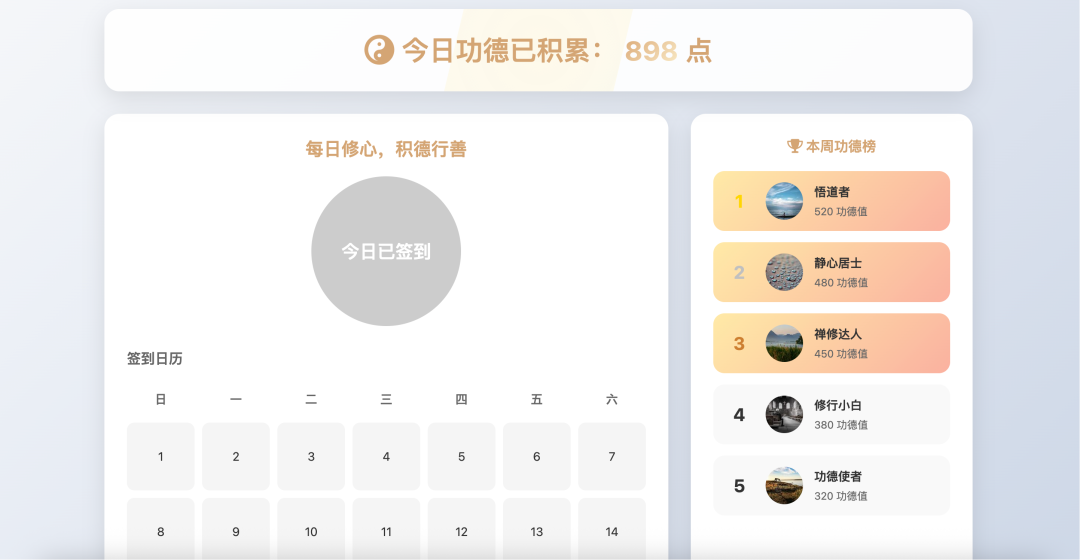 指令:制作一个功德计数器,用户每日签到可获得赛博功德值,并展示排行榜和可视化进度图。