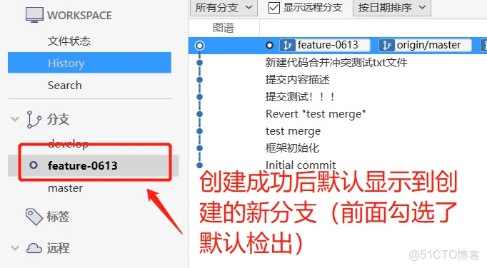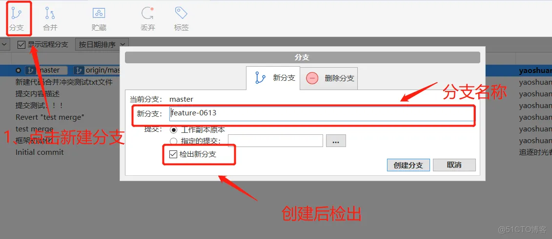 1:在新建分支时,我们需要在哪个主分支的基础上新建分支必须先要切换到对应的主分支才能到该主分支上创建分支,如下我们要在master分支上创建一个feature-0613分支: