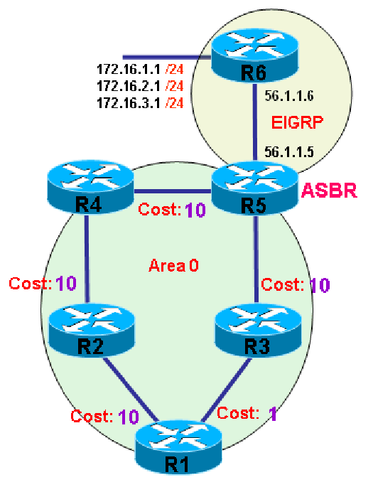 如果使用 O E1 类型重分布进 OSPF,并且取默认 Metric 值 20,那么 OSPF 域内的路由器在计算 Metric 值时,还会在原有 Metric 值的基础上,再加上到达 ASBR(R5)所需的 Metric 值,假设 R1 选择从 R3 到 R5 再到外部路由,那么 R1 到外部路由的 Metric 值为 20+1+10=31。