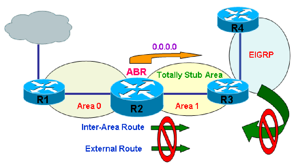 在 Totally Stub Area(完全末节区域)下,ABR 将过滤掉所有外部路由和其它 OSPF 区域的路由(Inter-Area Route)进入完全末节区域,同时,末节区域内的路由器也不可以将外部路由重分布进 OSPF 进程,即完全末节区域内的路由器不可以成为 ASBR。