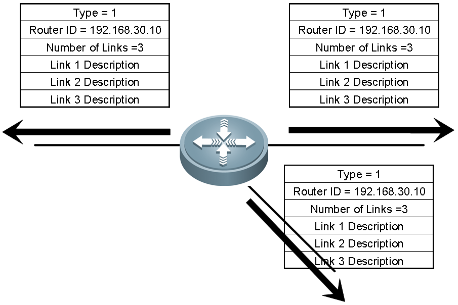 类型 1 的 LSA 是任何一台 OSPF 路由器都会产生的,每一台 OSPF 路由器的每一个 OSPF 接口都会有自己的链路状态,但是每台 OSPF 路由器只能产生一条类型 1 的 LSA,即使有多个 OSPF 接口,也只有一条类型 1 的 LSA,因为所有 OSPF 接口的链路状态是被打包成一条类型 1 的 LSA 发送的。