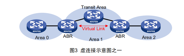 虚连接是指在两台 ABR之间通过一个非骨干区域而建立的一条逻辑上的连接通道。它的两端必须是 ABR,而且必须在两端同时配置方可生效。为虚连接两端提供一条非骨干区域内部路由的区域称为传输区(Transit Area)。