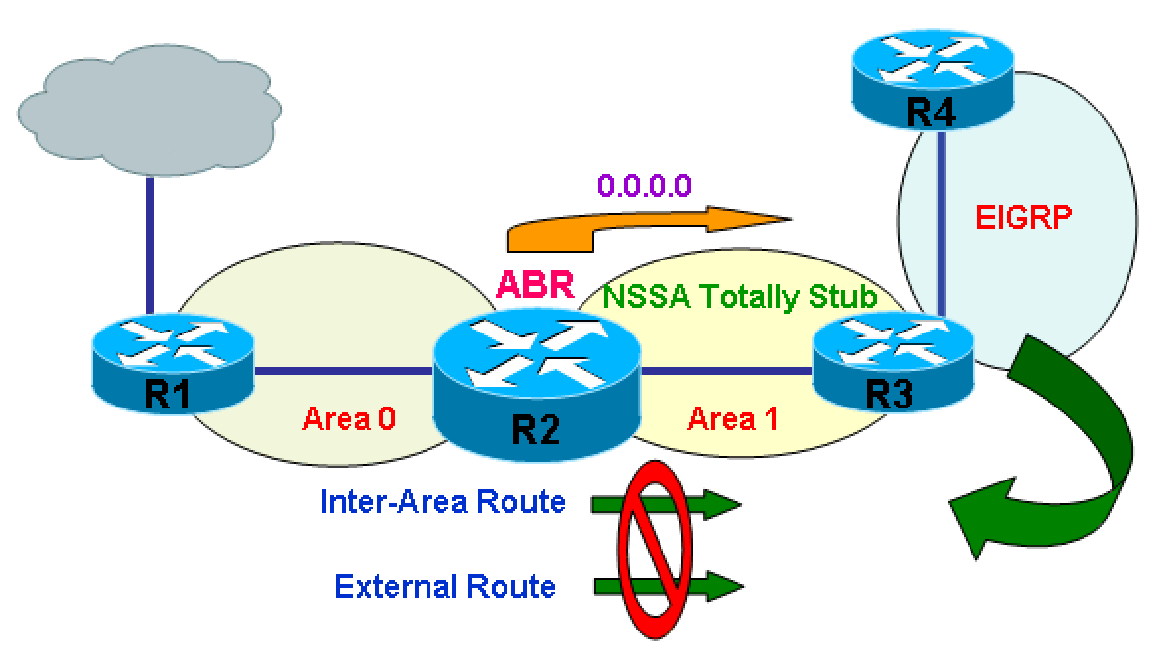在 Totally Not-so-Stubby Area(Totally NSSA)下,ABR 将过滤掉所有外部路由和其它 OSPF 区域的路由(Inter-Area Route)进入 Totally NSSA 区域,但路由器可以将外部路由重分布进 OSPF 进程,即 Totally NSSA 区域内的路由器可以成为 ASBR。