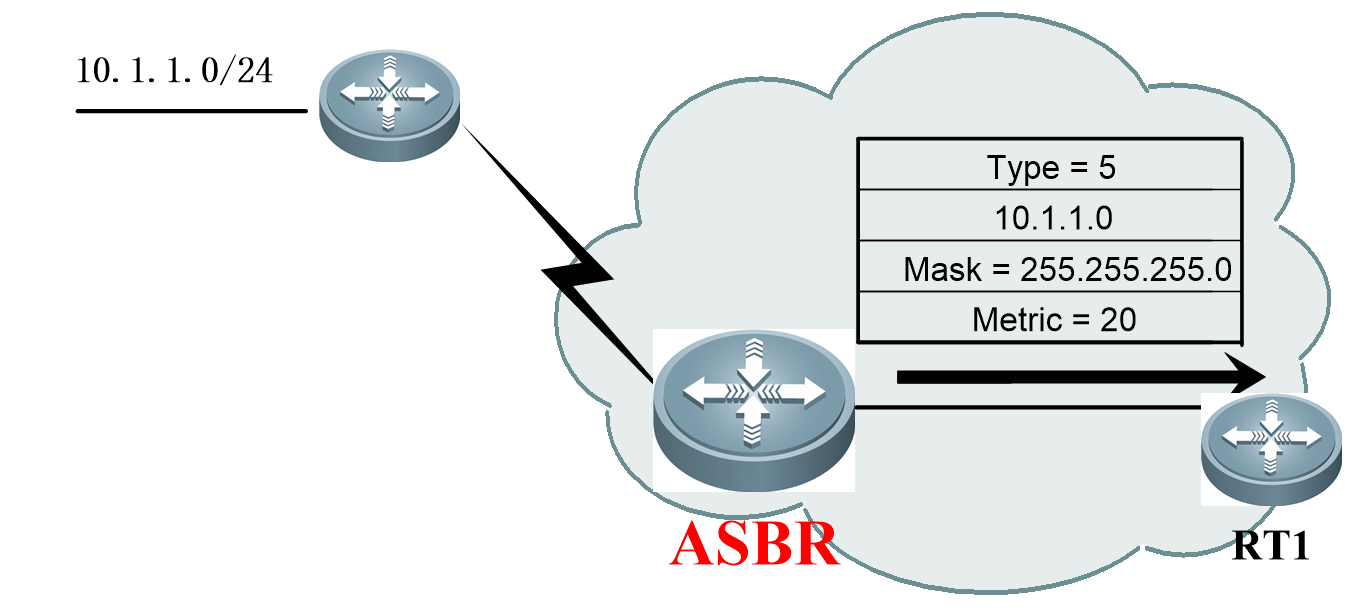 ASBR 将外部路由重分布进 OSPF 区域,同时 ASBR 向 OSPF 区域内发送类型为 5 的 LSA; OSPF 内的 ABR 在收到 LSA5 后,会发出 LSA4,告知其他的路由器,如何到达 ASBR。