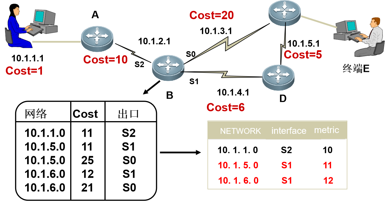 (2)使用 “跳数” 作为度量值,以跳数的多少比较路由路径的优劣。 RIP 选择一个具有最少路由器的路由 (即最短路由),哪怕还存在另一条高速 (低时延) 但路由器较多的路由。