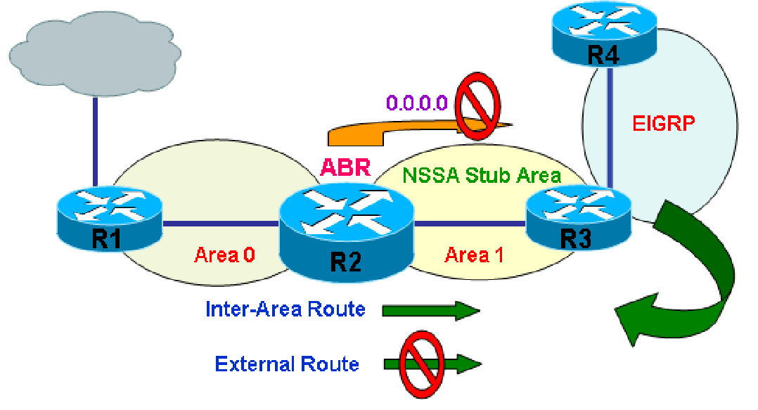在 Not-so-Stubby Area(NSSA)下,ABR 将过滤掉所有外部路由进入末节区域,同时也允许其它 OSPF 区域的路由(Inter-Area Route)进入 NSSA 区域,并且路由器还可以将外部路由重分布进 OSPF 进程,即 NSSA 区域内的路由器可以成为 ASBR。