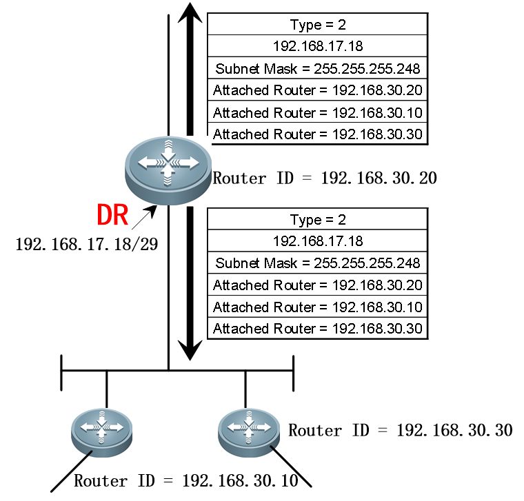 类型 2 的 LSA 只有在需要选举 DR/BDR 的网络类型中才会产生,并且只是 DR 产生,用于描述在该网络上连接的所有路由器及子网信息,BDR 没有权利产生。