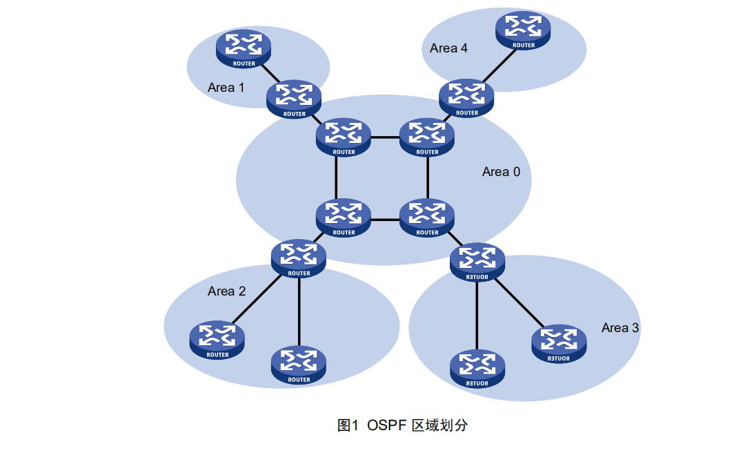 OSPF 协议通过将自治系统划分成不同的区域(Area)来解决上述问题。区域是从逻辑上将路由器划分为不同的组,每个组用区域号(Area ID)来标识。区域的边界是路由器,而不是链路。一个网段(链路)只能属于一个区域,或者说每个运行 OSPF 的接口必须指明属于哪一个区域。如图 1 所示。