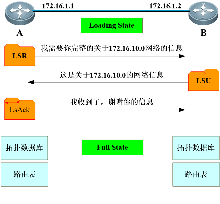 经过与第一次交换类似的流程后,三个路由器都形成了完整的路由表。