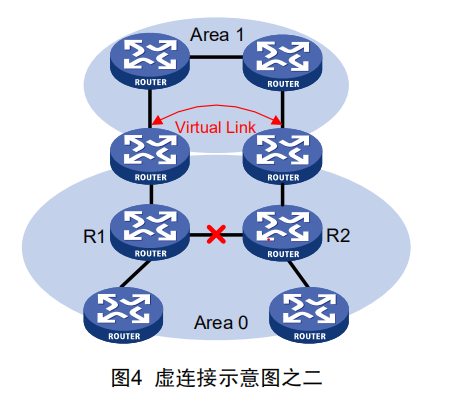 虚连接的另外一个应用是提供冗余的备份链路,当骨干区域因链路故障不能保持连通时,通过虚连接仍然可以保证骨干区域在逻辑上的连通性。如图 4 所示。