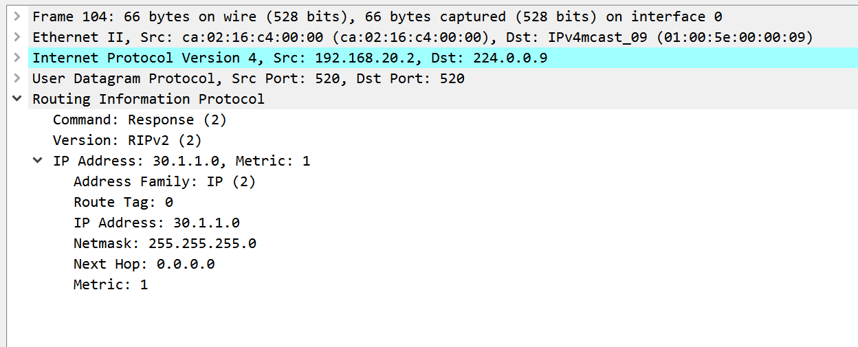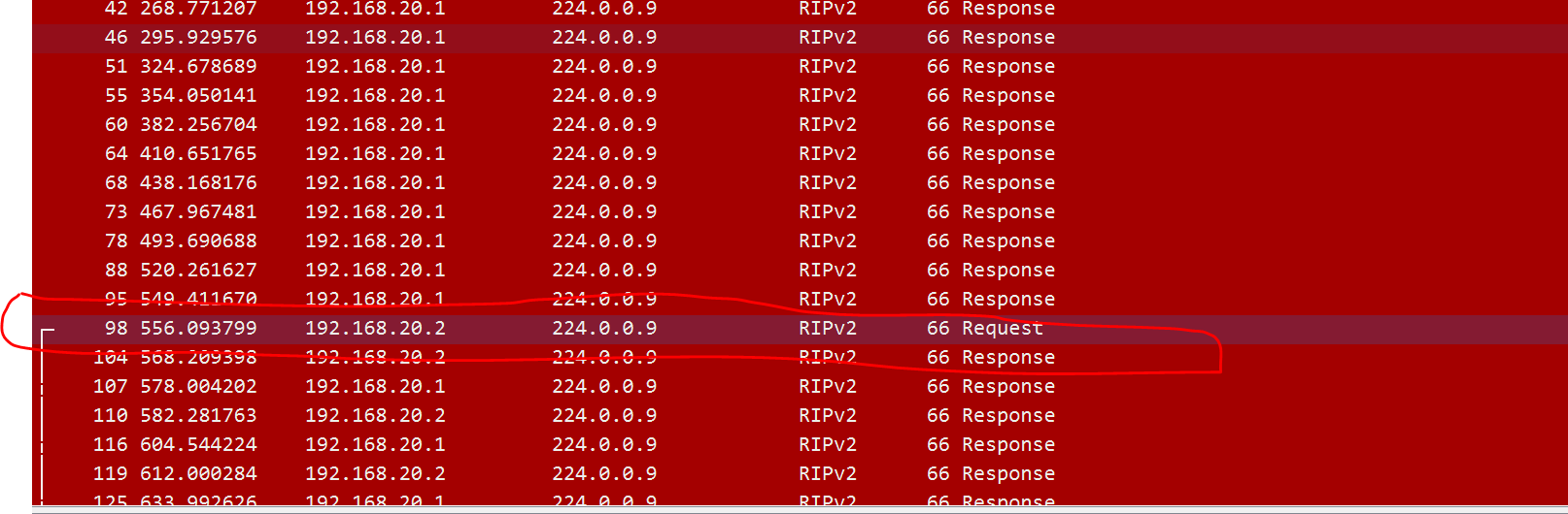 response 报文: 当 RIP 接收到 request 消息,将处理并发送一个 response 消息。消息包含自己的整个路由表,或请求要求的条目,正常情况下路由器通常不会发送对路由信息有特殊要求的请求消息。RIP 会每 30 秒发送一个 response 消息,用于路由表更新