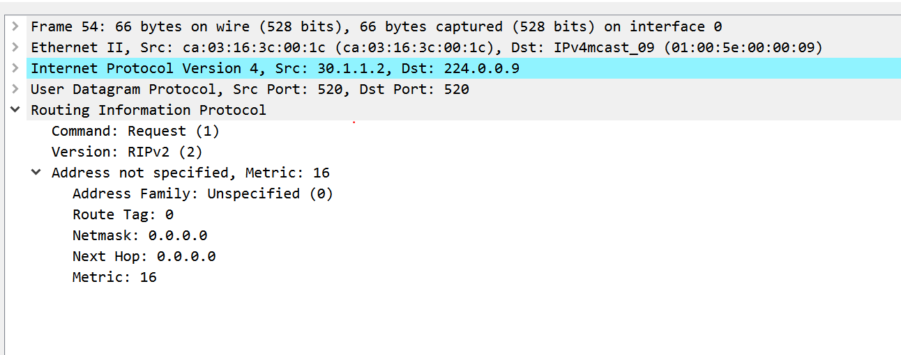 request 报文: RIP 的 request 消息在特殊情况下发送,当路由器需要时它可以提供即时的路由信息。 它可以请求全部的路由条目也可以请求具体的某些路由条目。最常见的例子是当路由器第一次加入网络时,通常会发送 request 消息,以要求获取相邻路由器的最新路由信息。 AFI 为 0 表示请求所有的路由条目且 metric 值为 16