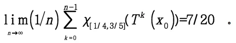 lim n → ∞ 1 n ∑ k = 0 n − 1 χ A ( T k ( x 0 ) ) = 7 20 \lim_{n \to \infty} \frac{1}{n} \sum_{k = 0}^{n - 1} \chi_A(T^k(x_0)) = \frac{7}{20} n→∞limn1k=0∑n−1χA(Tk(x0))=207
