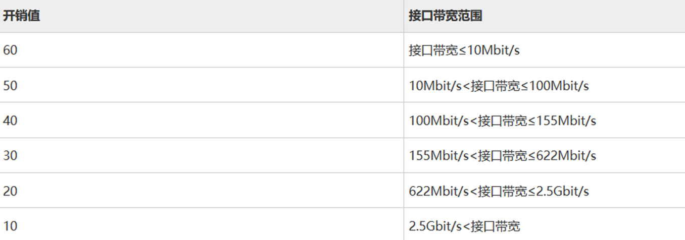 开销值 接口带宽范围 60 接口带宽≤10Mbit/s 50 10Mbit/s < 接口带宽≤100Mbit/s 40 100Mbit/s < 接口带宽≤155Mbit/s 30 155Mbit/s < 接口带宽≤622Mbit/s 20 622Mbit/s < 接口带宽≤2.5Gbit/s 10 2.5Gbit/s < 接口带宽
