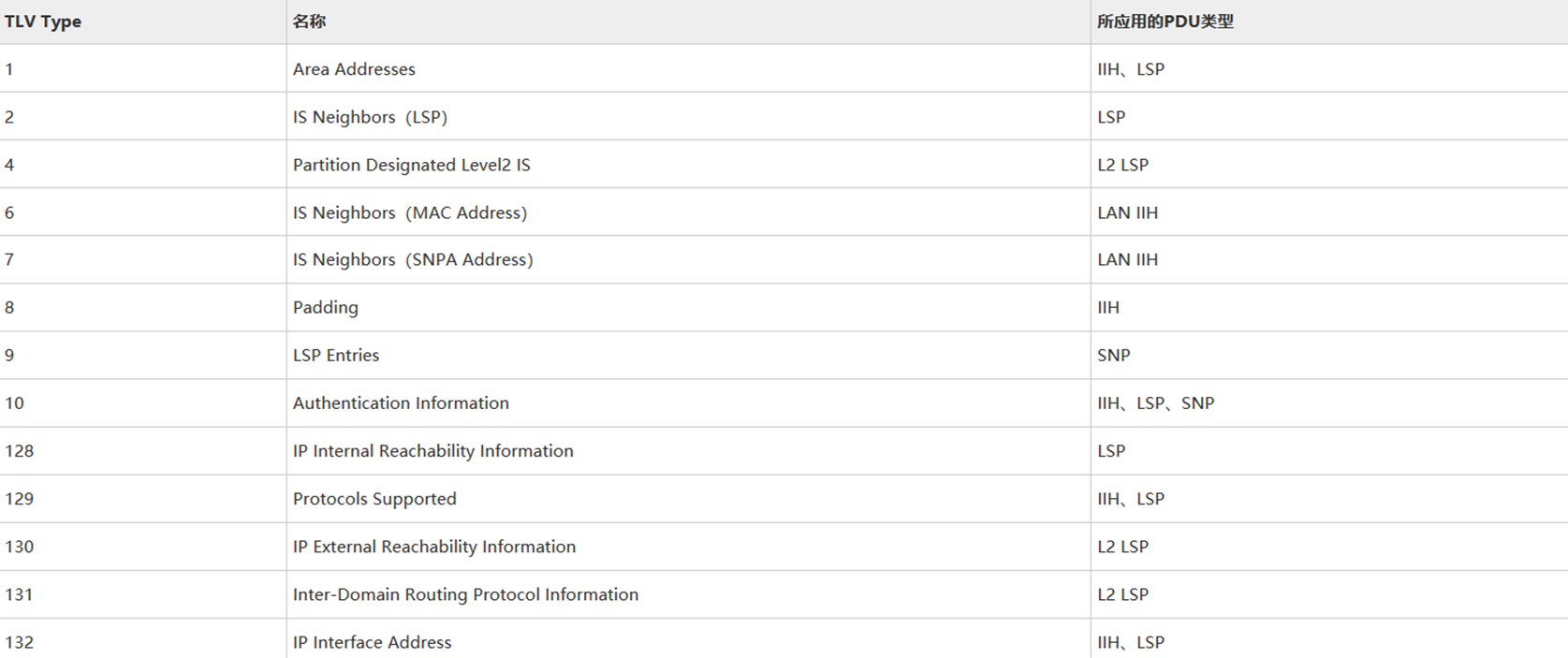 IS-IS 报文中的变长字段部分是多个 TLV(Type-Length-Value)三元组,TLV 也称为 CLV(Code-Length-Value)。