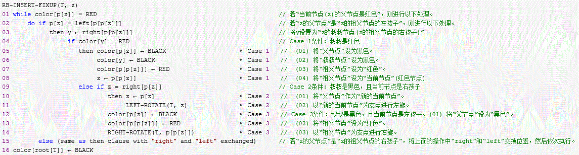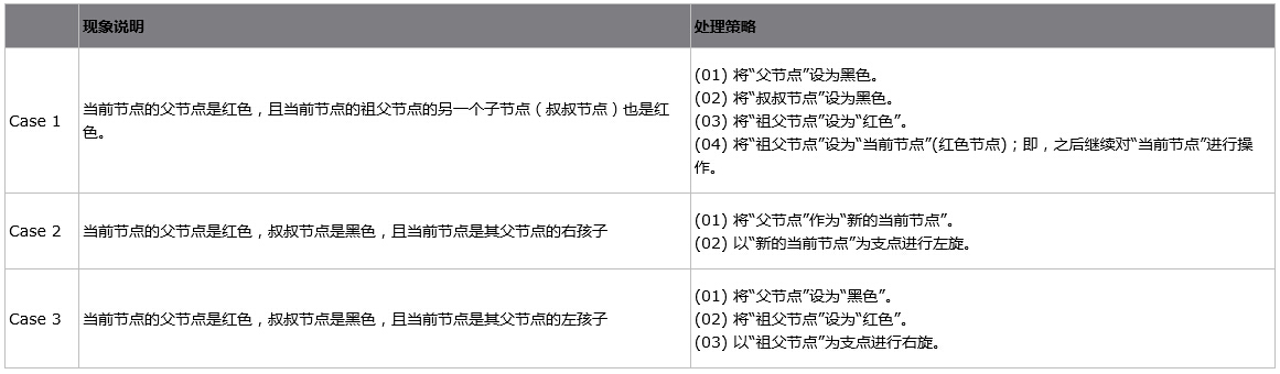 上面三种情况(Case)处理问题的核心思路都是:将红色的节点移到根节点;然后,将根节点设为黑色。下面对它们详细进行介绍。
