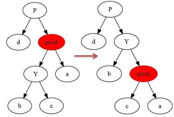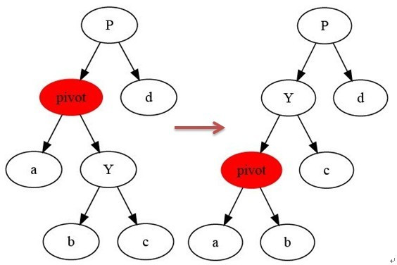 如上图所示,当在某个结点pivot上,做左旋操作时,我们假设它的右孩子y不是NIL[T],pivot可以为任何不是NIL[T]的左子结点。左旋以pivot到Y之间的链为“支轴”进行,它使Y成为该子树的新根,而Y的左孩子b则成为pivot的右孩子。