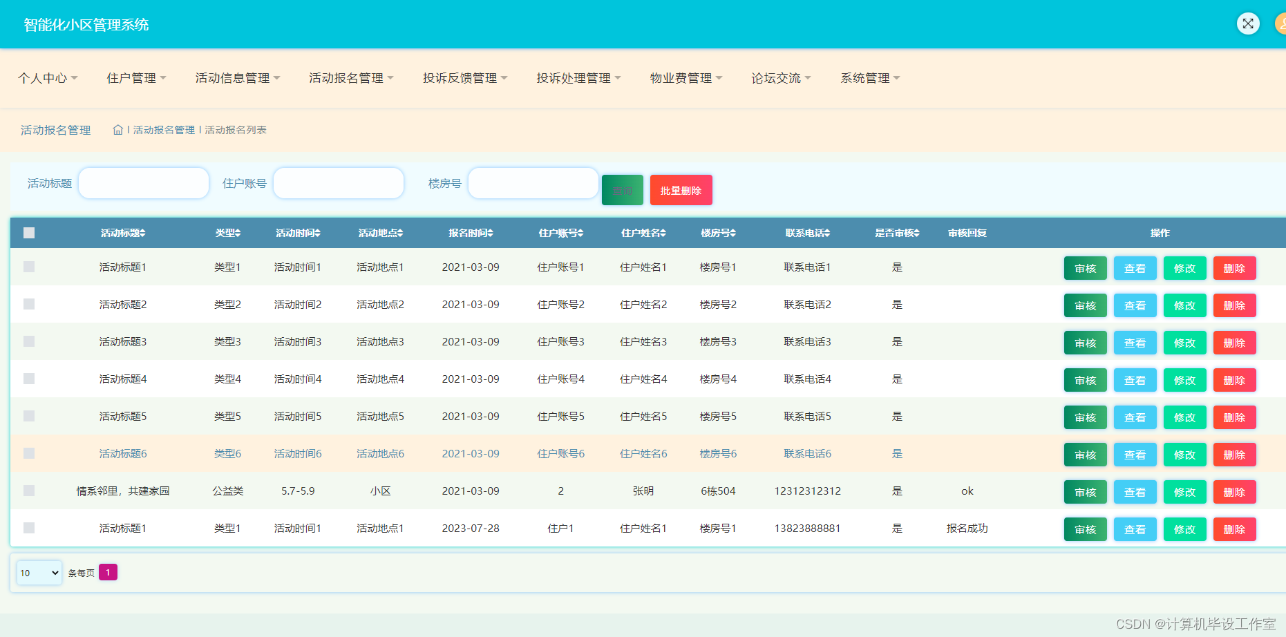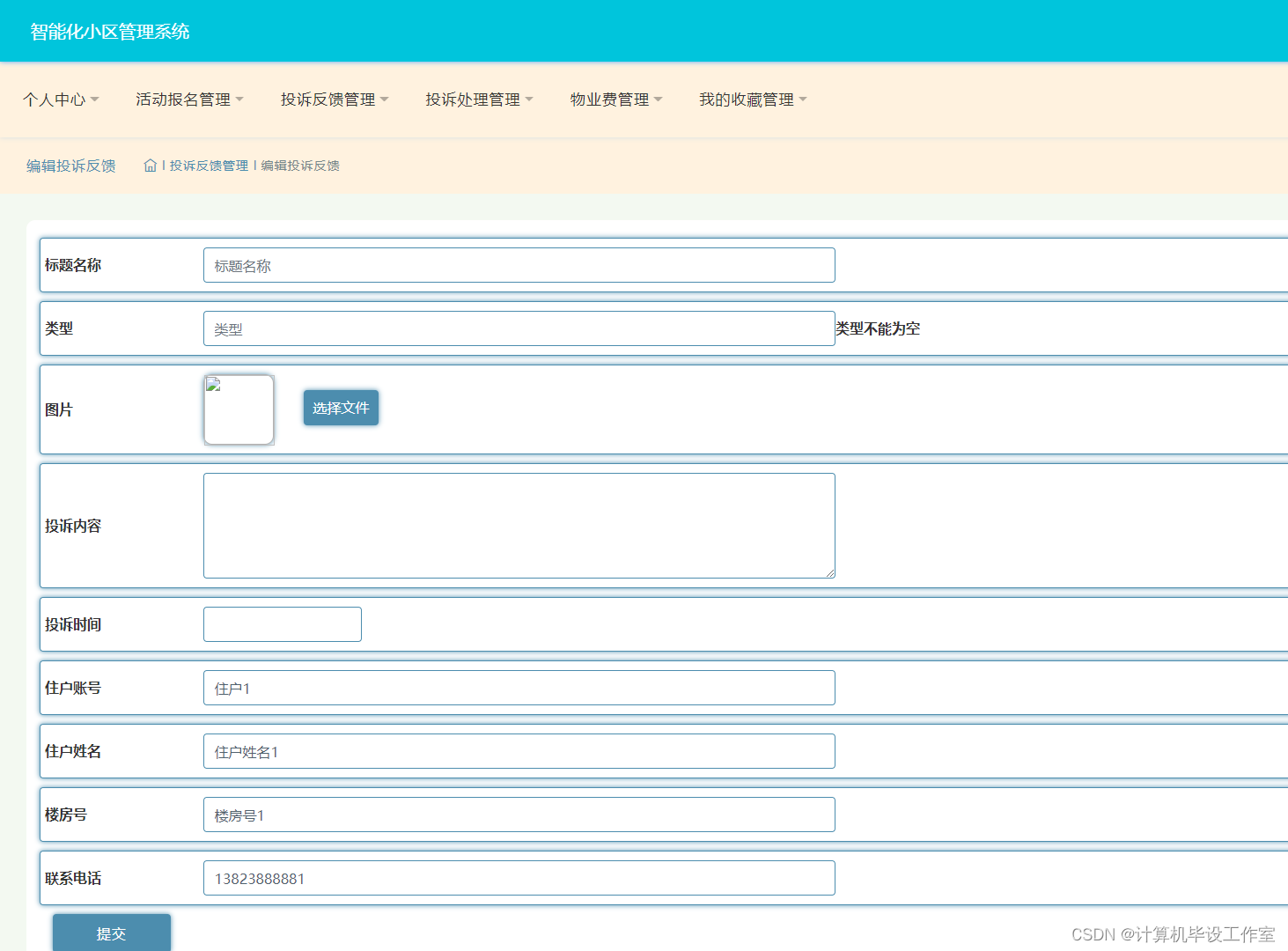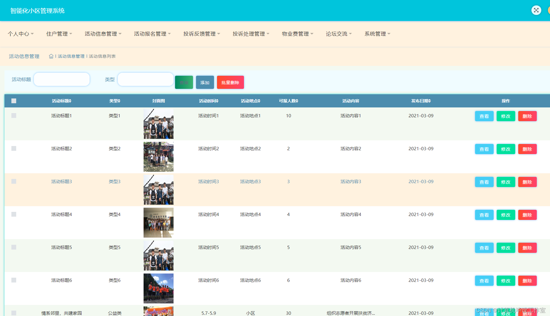 个人中心、住户管理、活动信息管理、活动报名管理、投诉反馈管理、投诉处理管理、物业费管理、论坛交流、系统管理 ,前台首页。通过这些功能模块的设计,基本上实现了整个智能化小区管理系统的过程。