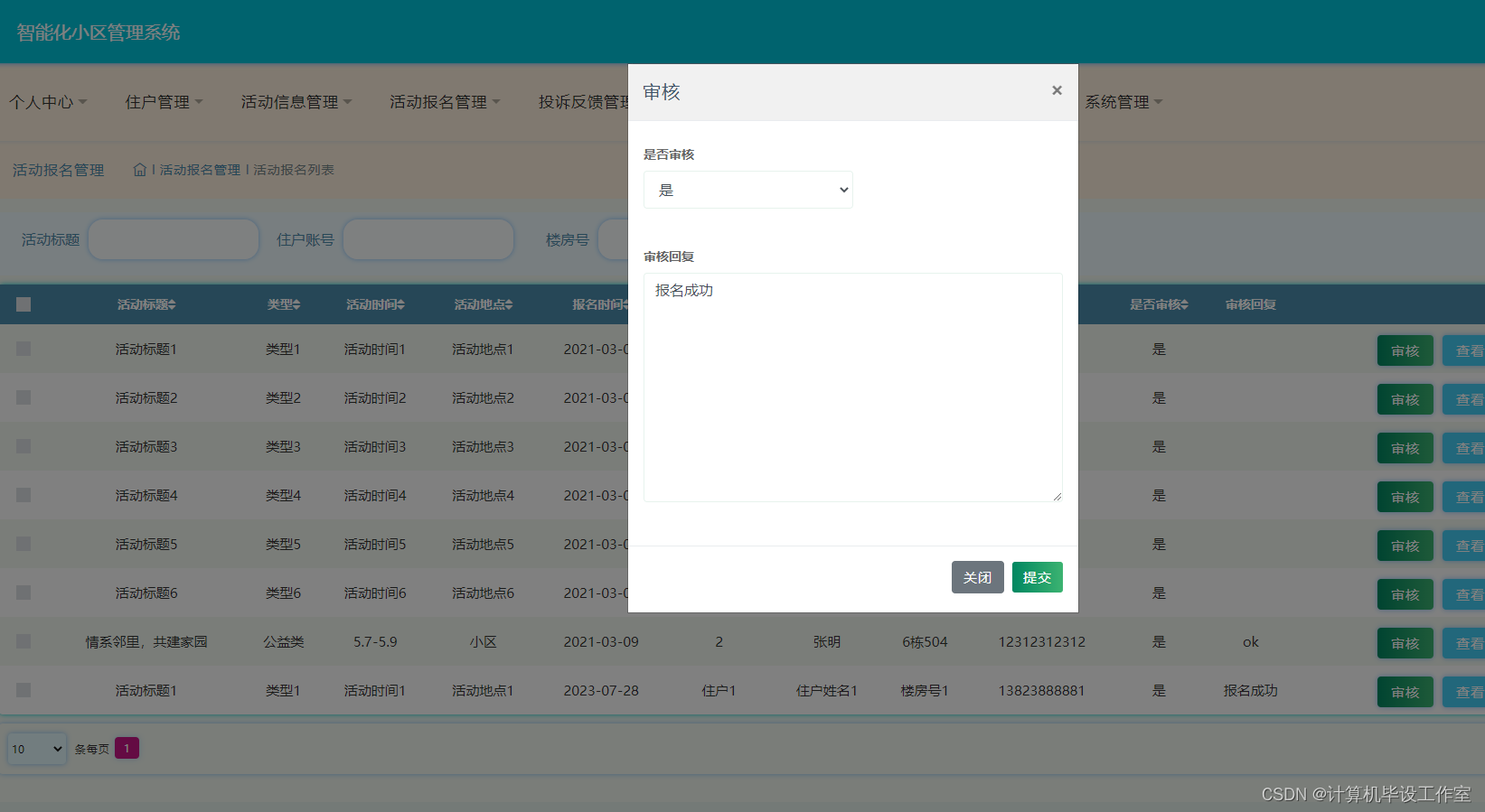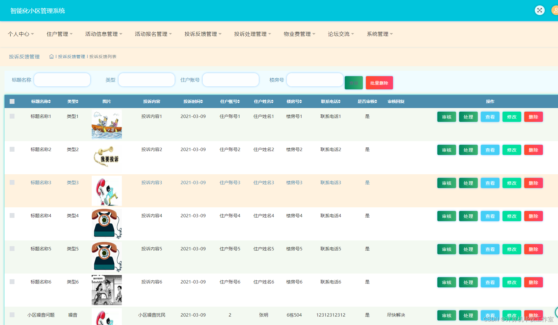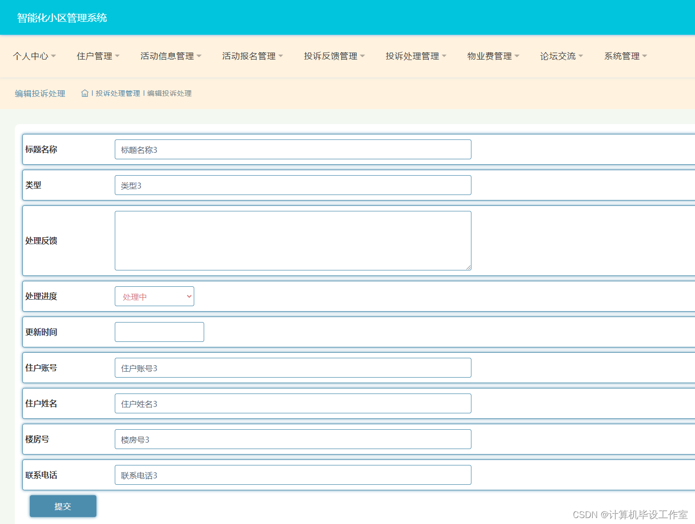 个人中心、住户管理、活动信息管理、活动报名管理、投诉反馈管理、投诉处理管理、物业费管理、论坛交流、系统管理 ,前台首页。通过这些功能模块的设计,基本上实现了整个智能化小区管理系统的过程。