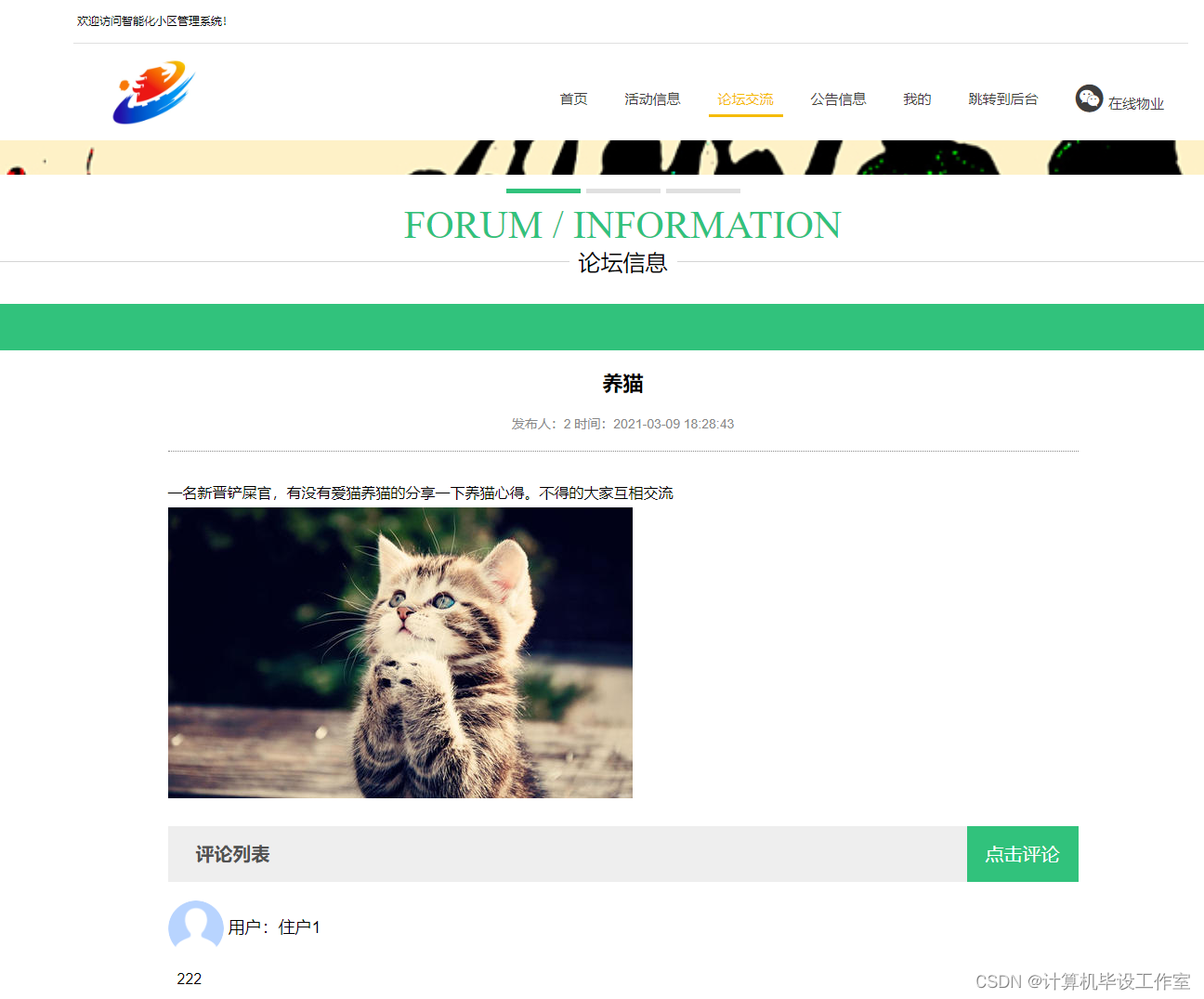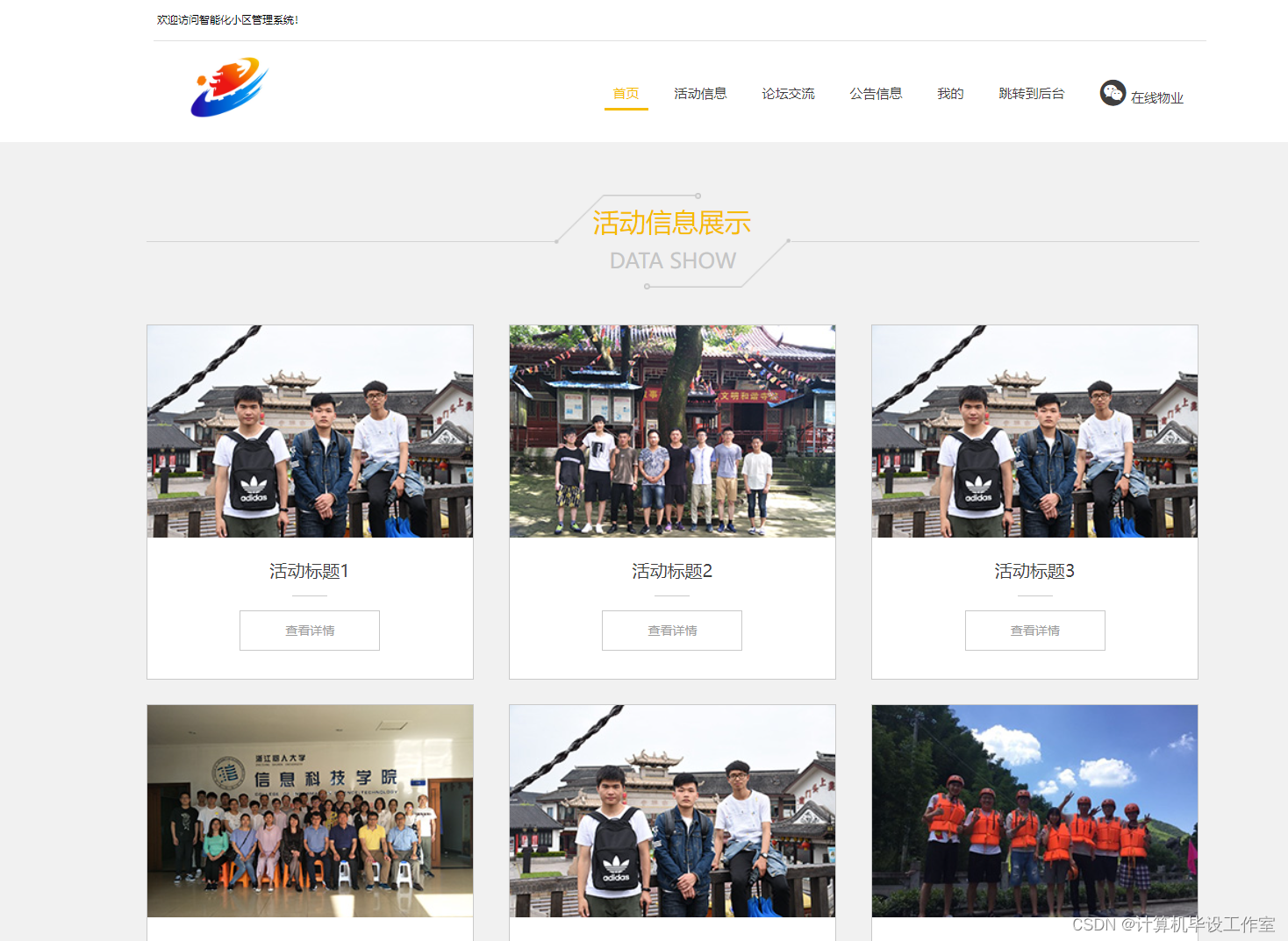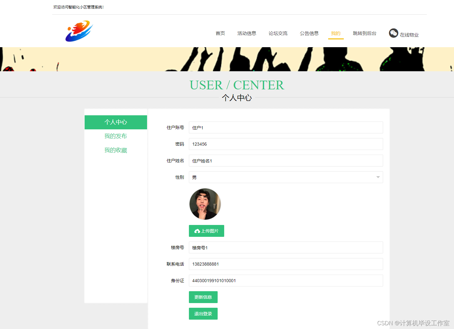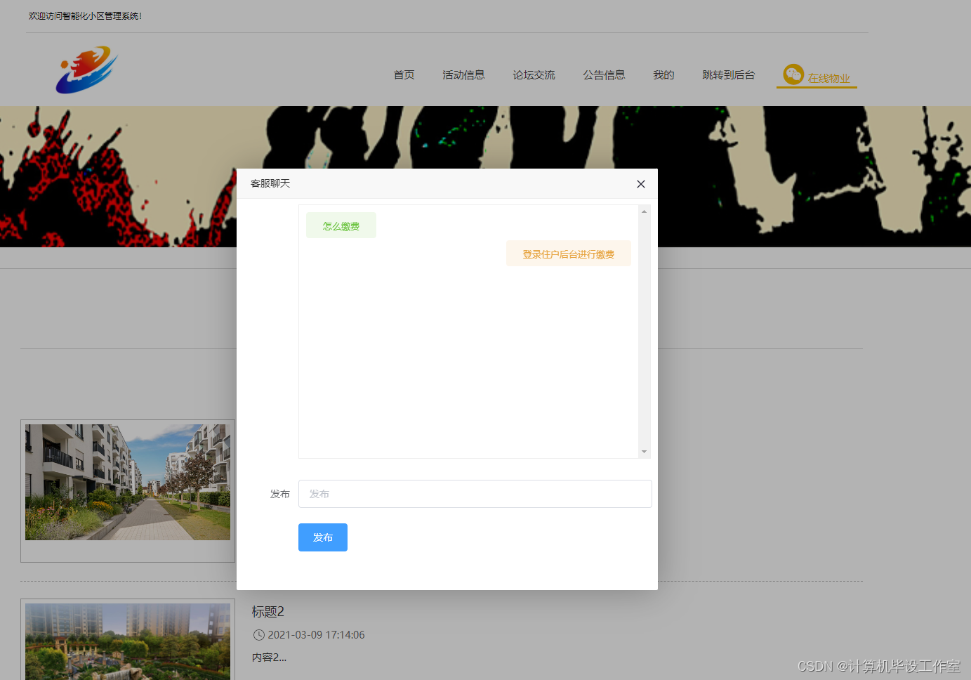 首页、活动信息、物业费缴费、论坛交流、公告信息、在线物业,个人中心、活动报名管理、投诉反馈管理、我的收藏管理等功能