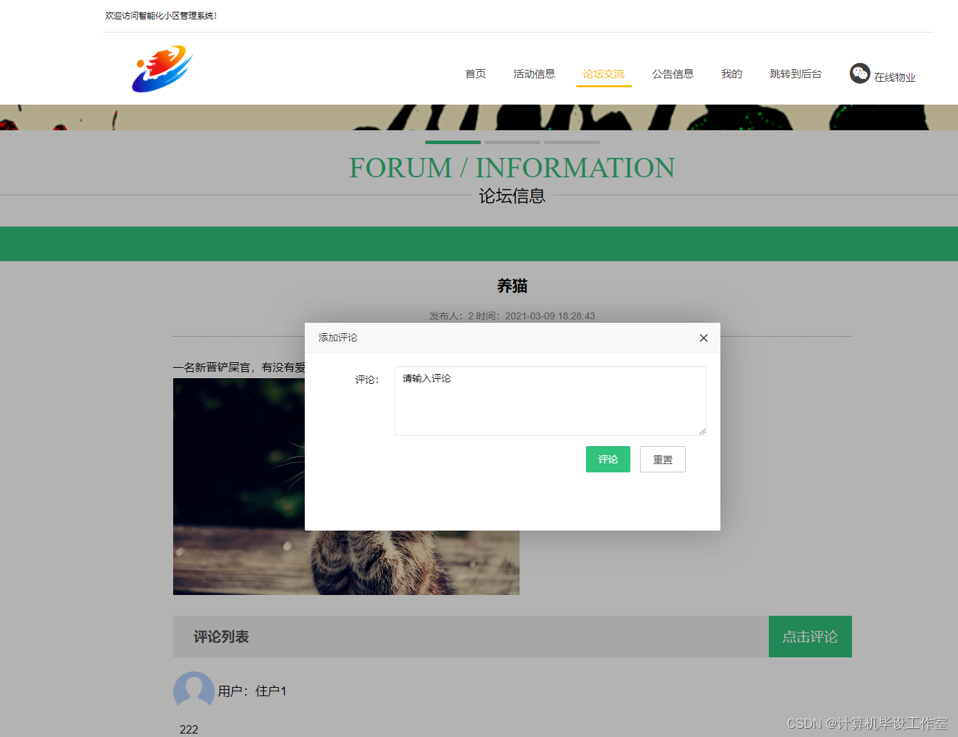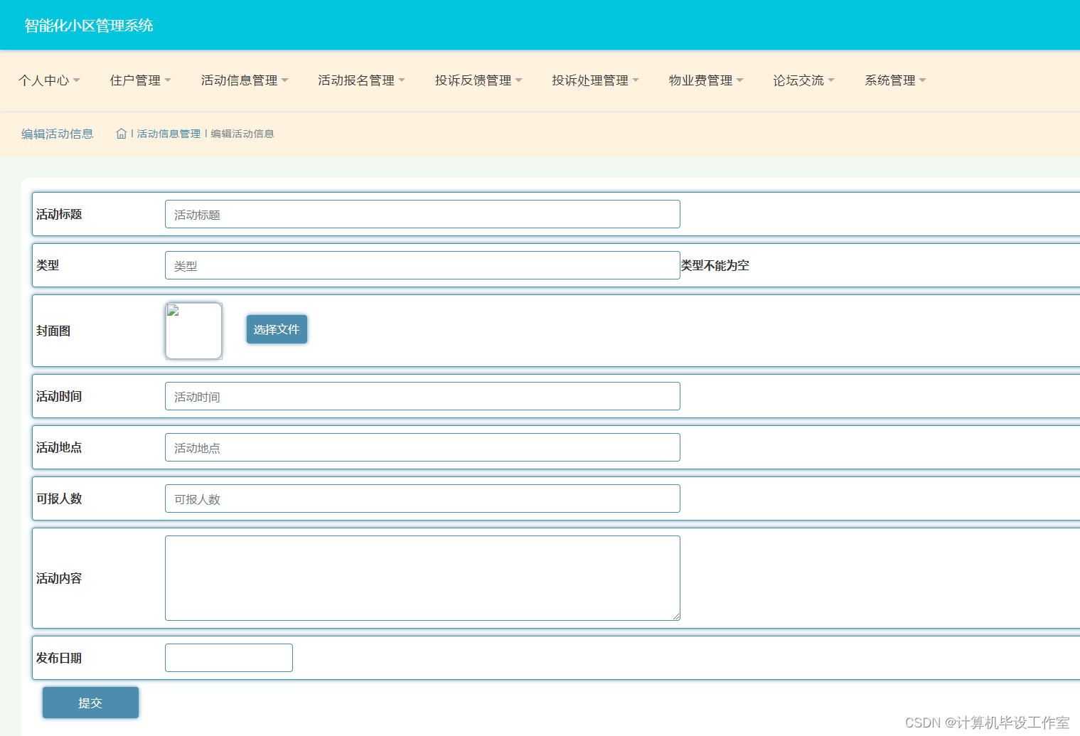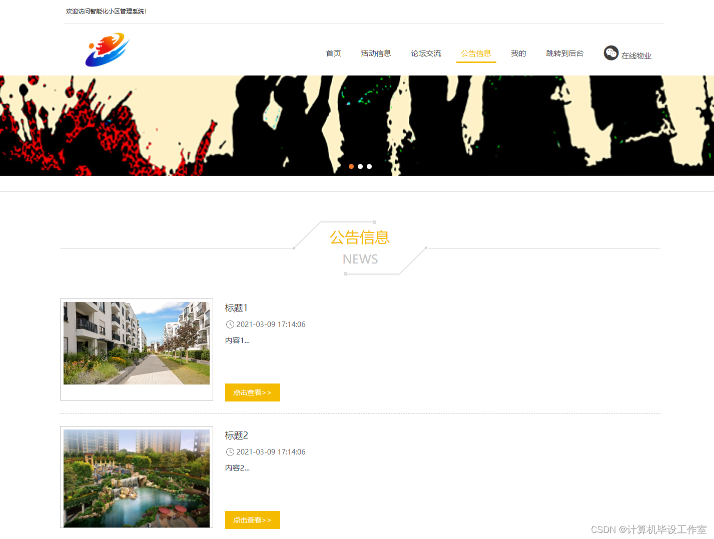 首页、活动信息、物业费缴费、论坛交流、公告信息、在线物业,个人中心、活动报名管理、投诉反馈管理、我的收藏管理等功能