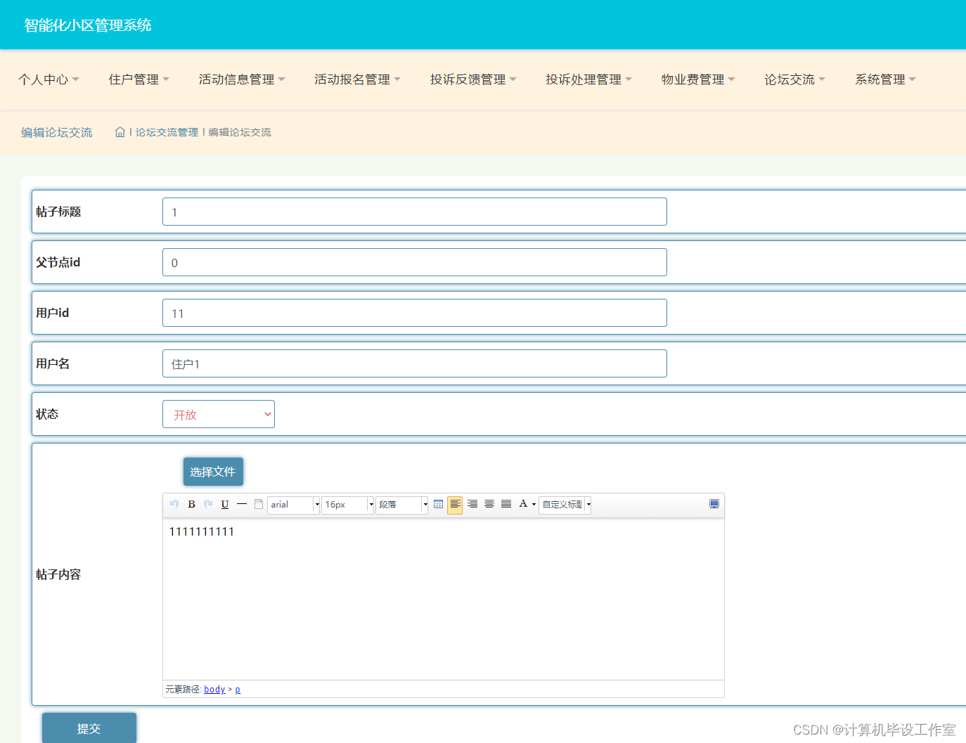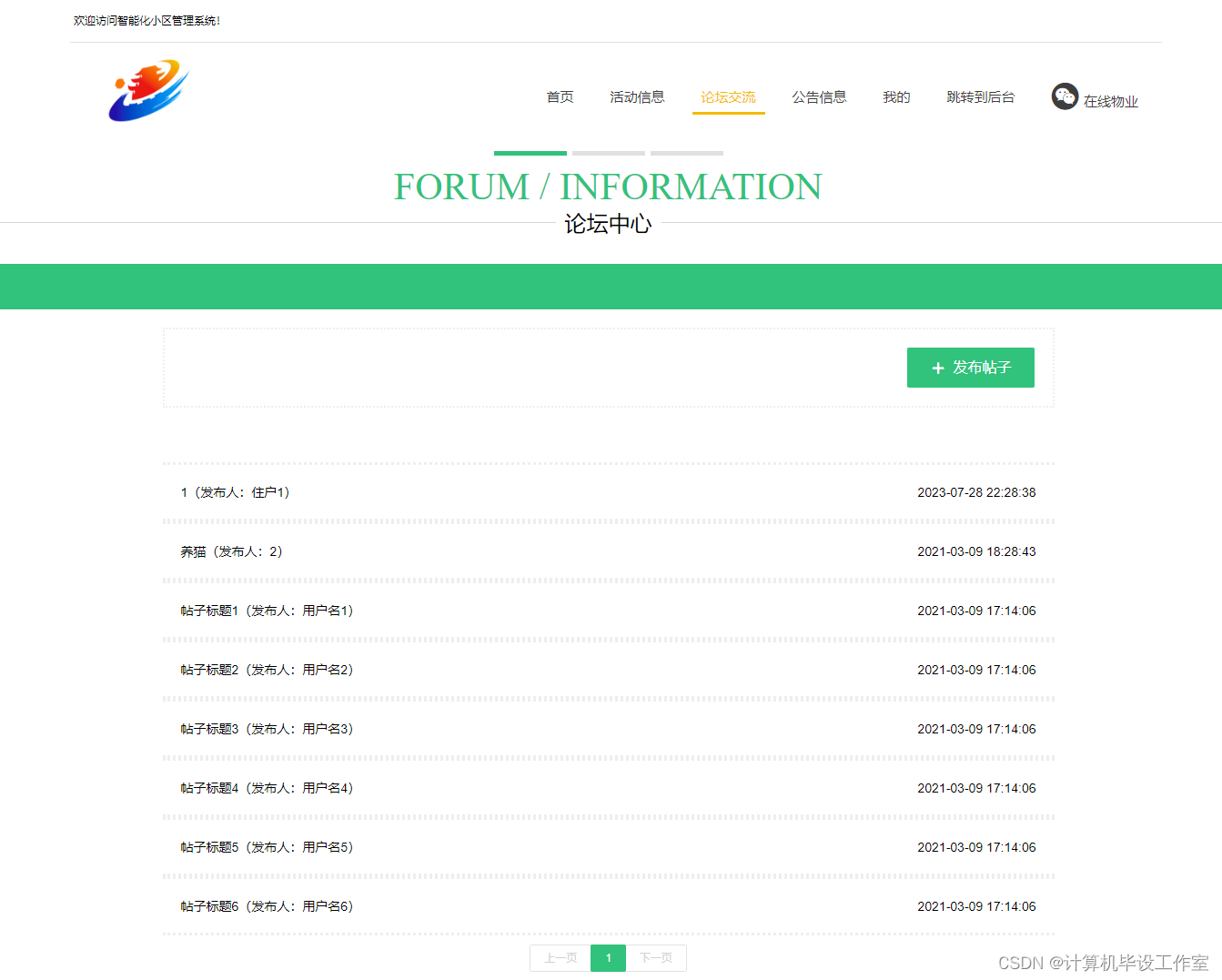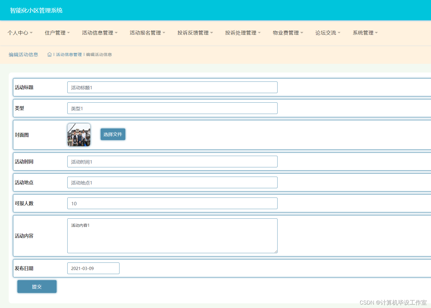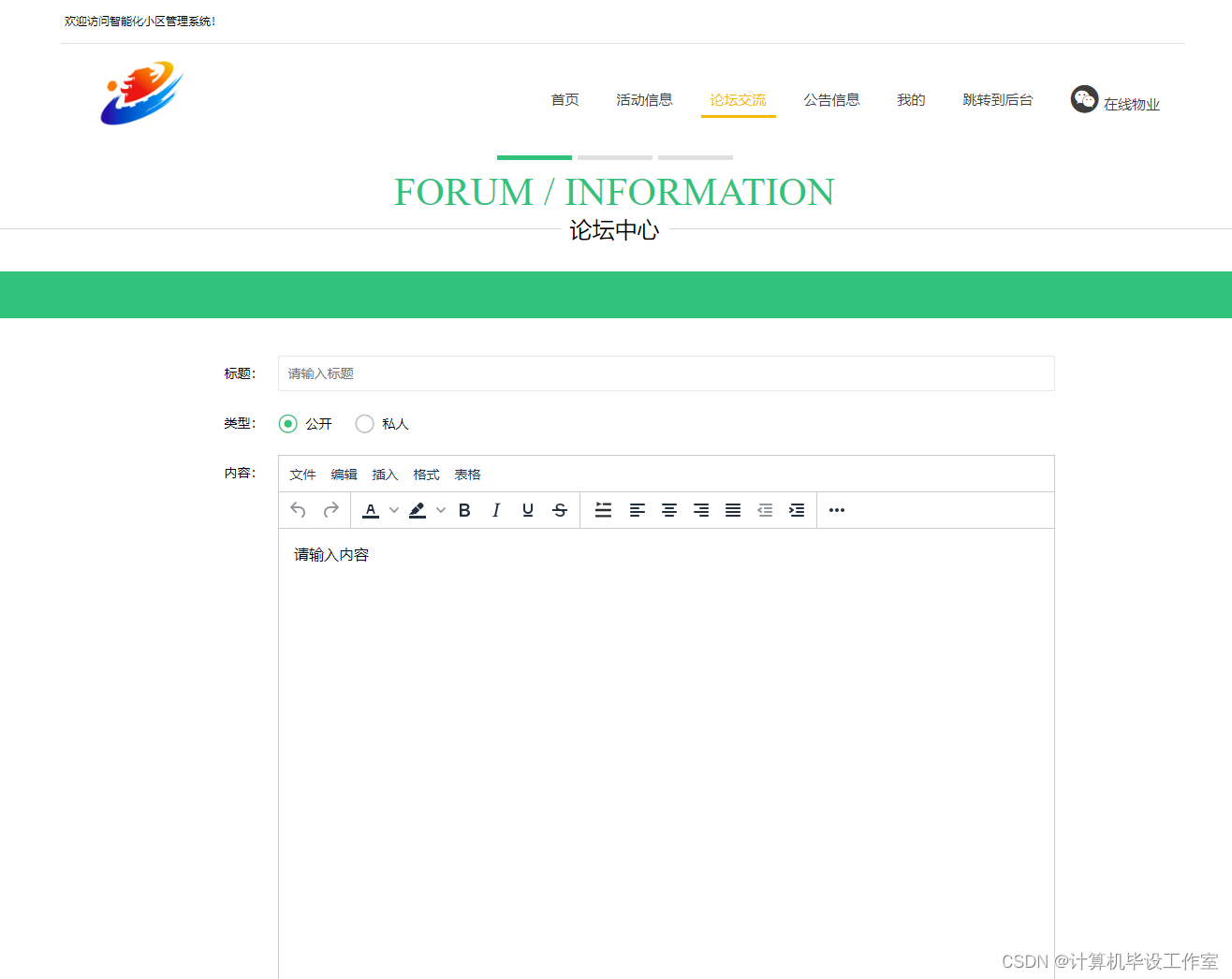 首页、活动信息、物业费缴费、论坛交流、公告信息、在线物业,个人中心、活动报名管理、投诉反馈管理、我的收藏管理等功能
