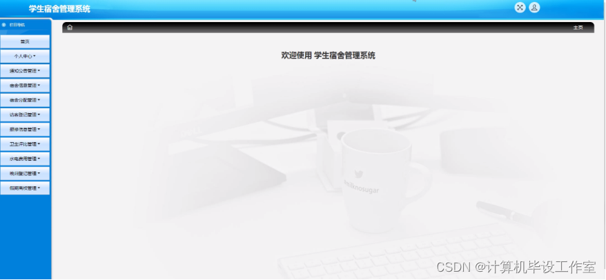 管理员进入主页面,主要功能包括对首页、个人中心、宿管员管理、学生管理、院系简介管理、通知类型管理、通知公告管理、宿舍信息管理、宿舍分配管理、访客登记管理、报修信息管理、卫生评比管理、水电费用管理、晚归登记管理、假期离校管理、系统管理等进行操作。管理员主页面如图5-2所示: