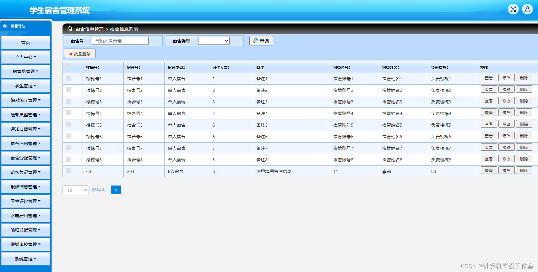 管理员点击宿舍信息管理,在宿舍信息管理页面对楼栋号、宿舍号、宿舍类型、可住人数、备注、宿管账号、宿管姓名、负责楼栋等信息,可以查询或删除宿舍信息等操作。如图5-6所示: