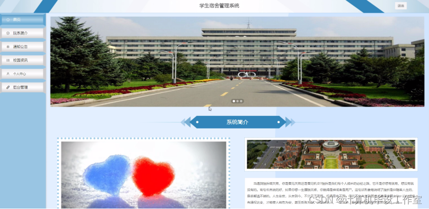 当游客打开系统的网址后,首先看到的就是首页界面。在这里,游客能够看到学生宿舍管理系统的导航条显示首页、院系简介、通知公告、校园资讯 、个人中心、后台管理等。系统首页界面如图5-14所示: