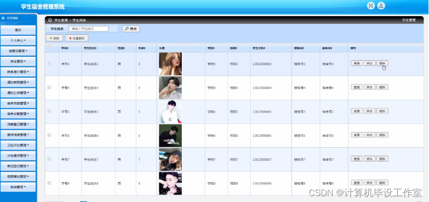 管理员点击学生管理,在学生管理页面输入学号、学生姓名、性别、年龄、头像、学院、班级、学生手机、楼栋号、宿舍号等信息,可以查询,添加或删除学生信息等操作。如图5-4所示: