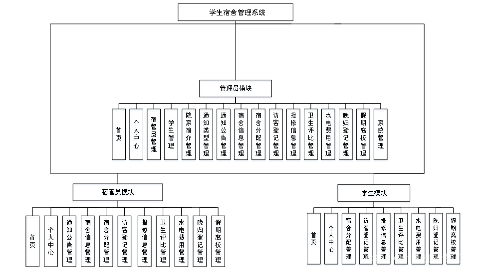 课题主要分为三大模块:即学生、宿管员、管理员的模块,主要功能包括:宿管员、学生、通知公告管理、宿舍信息、宿舍分配、访客登记、报修信息、卫生评比、水电费用、晚归登记、假期离校等信息管理;